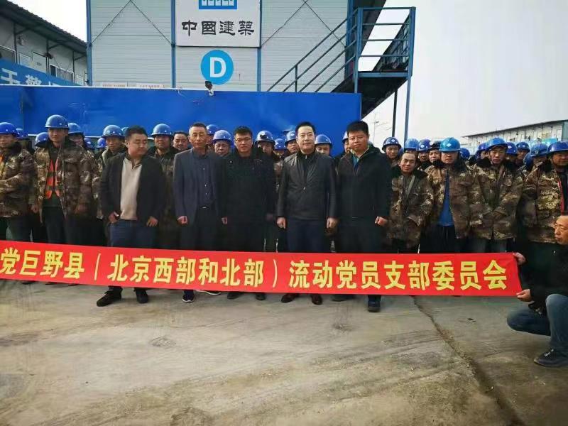 院子里,两个人拉着“中国共产党巨野县(北京西部和北部)流动党支部委员会”的红色条幅。条幅前,两张桌子一字排开,支部书记史长安端坐中间,返乡创业办公室主任樊长春、副主任李吉民分坐两旁。他们面前是本次捐赠的对象——73个机电安装工人和13个管理人员,共计86人。