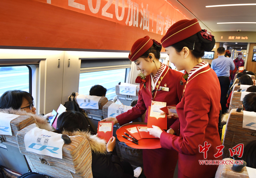 12月31日,铁路天津客运段京津城际乘务人员在C2019次列车上为旅客赠送纪念车票和新年贺卡。
