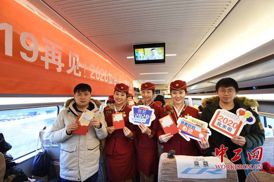 12月31日,铁路天津客运段京津城际乘务人员在C2019次列车上举行“2019再见!2020加油!向着梦想出发!”主题活动并与旅客合影留念。