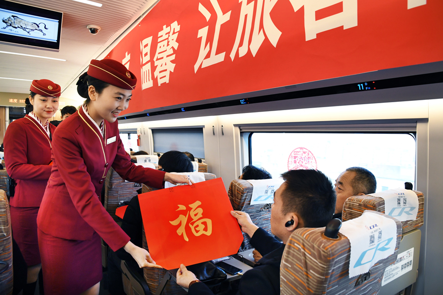 次列车上举办“平安、有序、温馨,让旅客体验更美好”主题活动,为旅客赠送福字、福袋。摄影 杨宝森