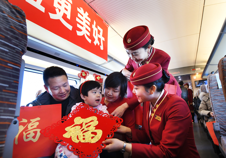 次列车上举办“平安、有序、温馨,让旅客体验更美好”主题活动,为旅客赠送福字、福袋。摄影 杨宝森