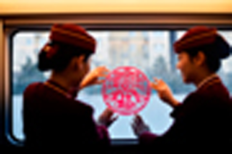 次列车上举办“平安、有序、温馨,让旅客体验更美好”主题活动,乘务人员布置车厢贴窗花。摄影 杨宝森