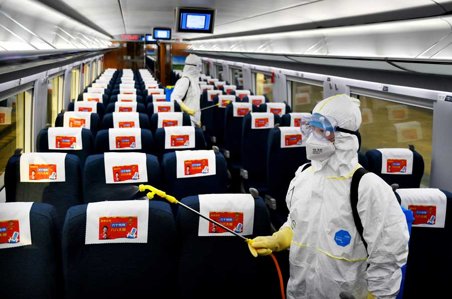 4月30日,天津铁路疾控中心工作人员正在对G291次终到列车进行终末消毒。