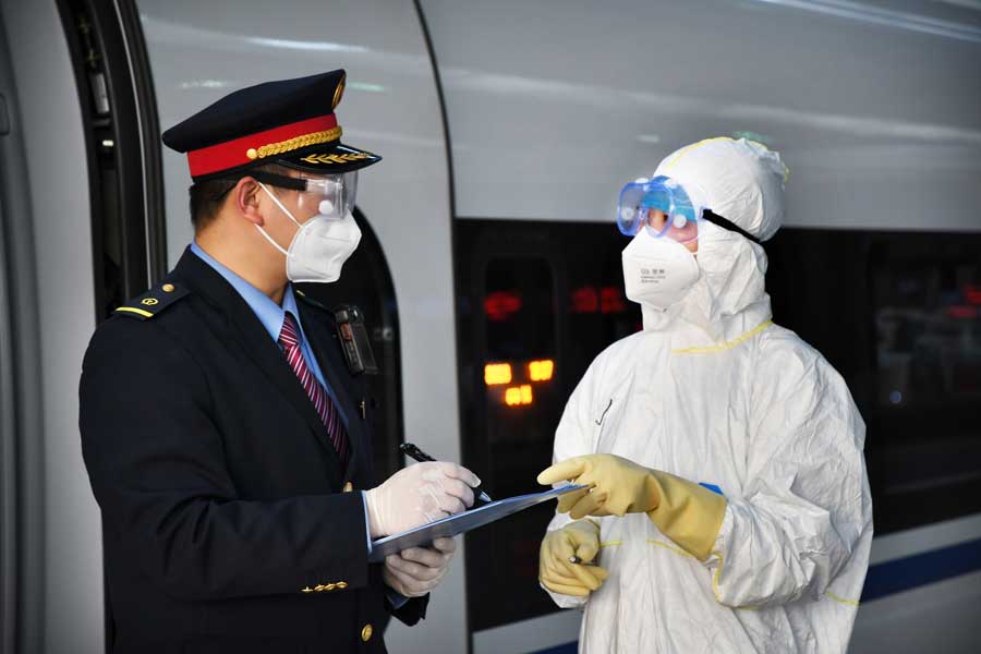 4月30日,天津客运段值乘的G291次终到列车车长与天津铁路疾控中心工作人员对列车防控情况进行对接。