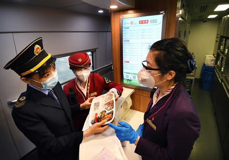 4月30日,天津铁路疾控中心工作人员正在对天津客运段值乘的G213次始发列车进行食品安全督导。