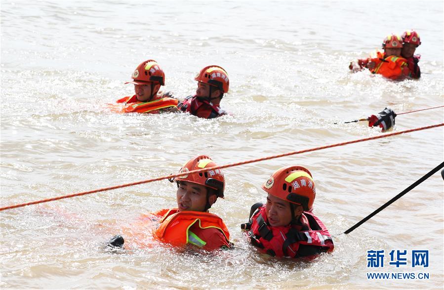 6月15日,在湘江湖南省衡阳市段雁峰区东洲岛水域,参加演练人员在进行水上救人任务演练。 6月15日,湖南省衡阳市举行模拟多种突发情况的防汛救援演练,全面提升应急救援队伍的快速反应及协同救援能力。 新华社发(曹正平 摄)