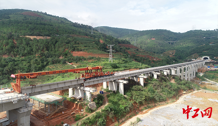 中铁一局玉磨铺架制梁项目部担负中老铁路国内玉磨段508公里的铺轨,412孔桥梁的制架,425组道岔的铺设任务,截止目前,累计完成正线铺轨123公里、架梁193孔,道岔铺设147组。完成任务量的24.2%,45.4%,34.5%。