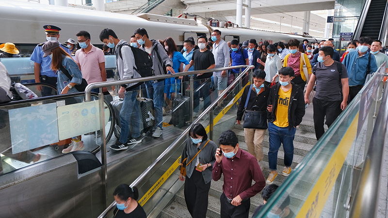 11月6日,乘坐环岛高铁C7404次列车的旅到达海口北站后陆续出站。