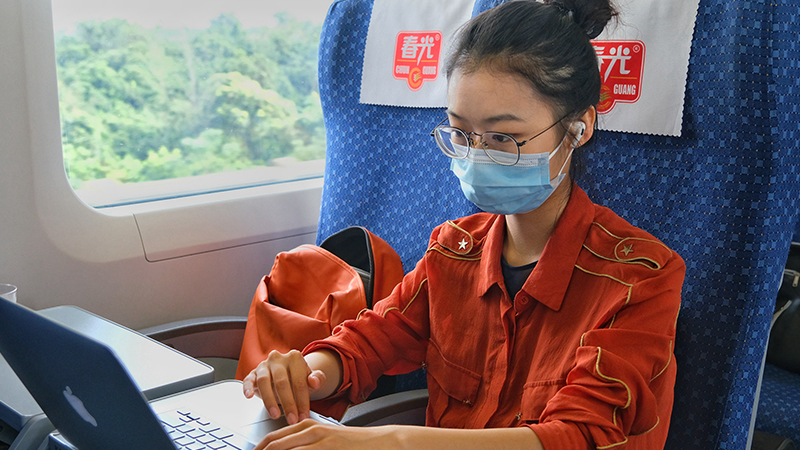 11月6日,乘坐环岛高铁C7404次列车的旅客途中使用电脑办公。