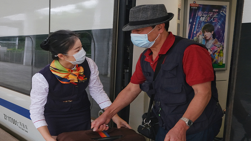 11月6日,广铁集团环岛列车C74O4次乘务人员为旅客提供帮扶服务。