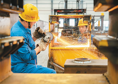 近年来,中铁十一局集团汉江重工有限公司瞄准发展机遇,进军千吨级高铁箱梁施工装备市场。图为该公司生产厂区内,工人在打磨架桥机部件。