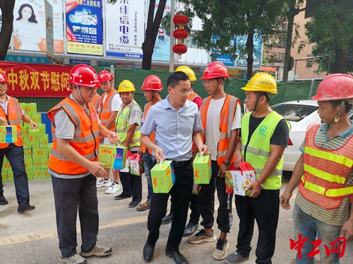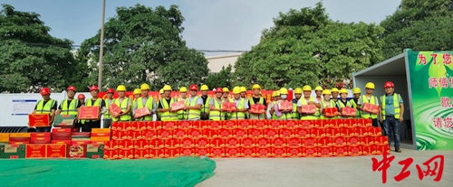 中工网讯(中工网记者刘友婷)近日,在刚刚完成沥青路面恢复的中铁二局深圳公司东莞市东江下游片区水污染综合治理项目莞城污水收集系统工程施工现场,项目经理将慰问品递到工人手中,并亲切交谈慰问。