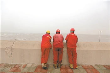 10月1日,冀东油田井下作业公司作业二队的3名员工在作业间隙伏在防浪墙上眺望大海。节日里,他们何尝不想家。