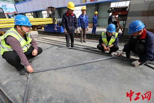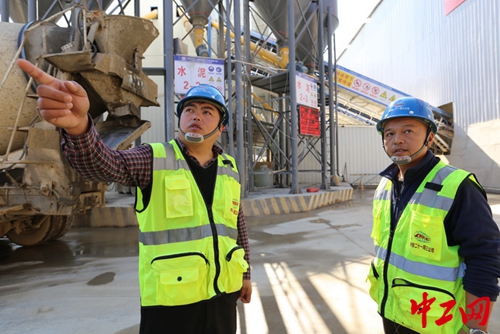 图为杨鹏涛(左)在检查钢筋加工厂生产情况
