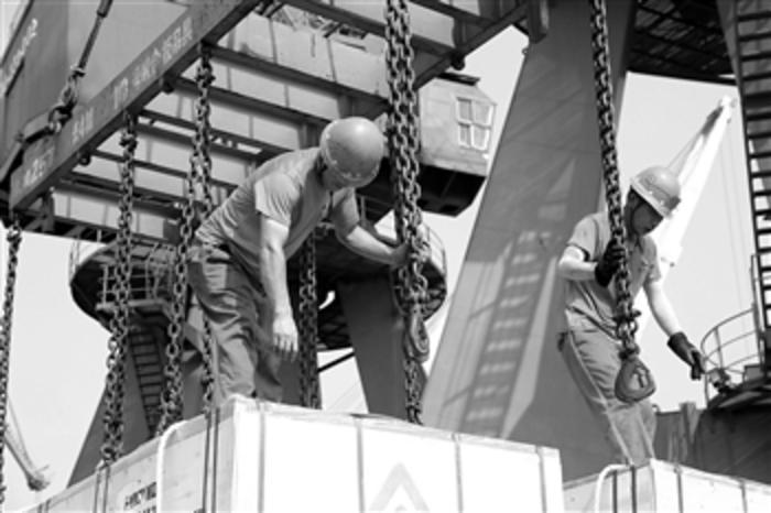 近日,江苏省连云港港口码头上数千名工人不畏高温酷暑,在滚滚热浪中挥汗如雨奋战在工作岗位上,以确保港口生产运行态势保持平稳较快增长。