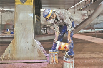 7月3日上午,记者来到造船厂的涂装课(车间),几位油漆工人拎着油漆桶进进出出,深色工装和鞋子上早已是印迹斑斑。