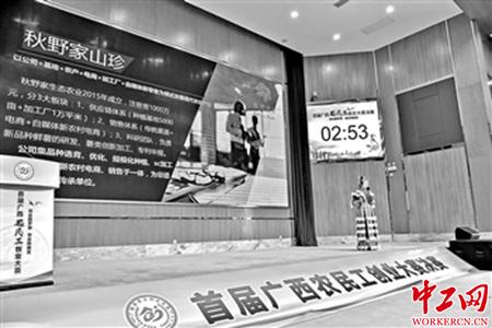11月10日,首届广西农民工创业大赛决赛在南宁·中关村创新示范基地举行,经过激烈角逐,《互联网+扶贫红薯创新深加工》项目夺得大赛成长组一等奖,获得奖金10万元。决赛不仅展示了从全区遴选出的20个优秀农民工创业项目,也充分展现了广西农民工创业者的风采。图为参赛选手在展示自己的创业项目。工人日报—中工网记者 庞慧敏 通讯员 杨 樯 摄