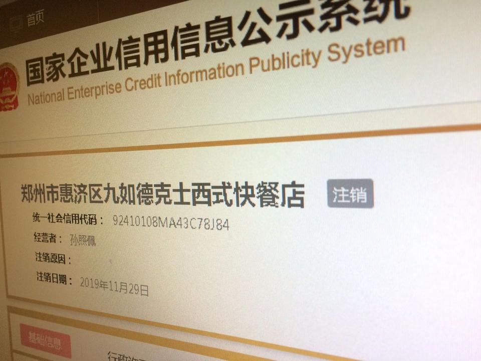 记者通过国家企业信用信息公示系统查询,结果显示:郑州市惠济区九如德克士西式快餐店,确实已经于2019年11月29日注销。