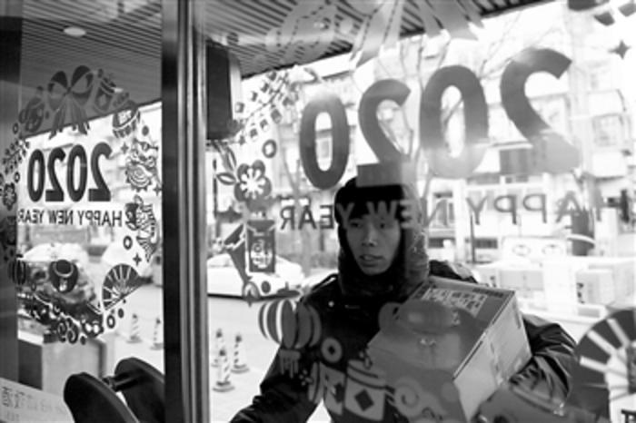 下图:李付彬拿着包裹进入一家酒店进行配送,酒店门口贴上了“2020”的字样。