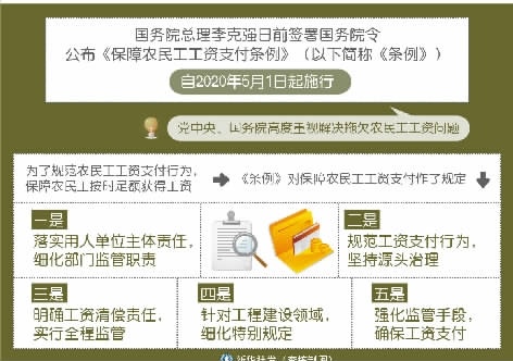 2019年12月4日召开的国务院常务会议审议通过了《条例(草案)》,明确用人单位主体责任、政府属地责任和部门监管责任,要求按约定及时足额支付农民工工资。《条例》自2020年5月1日起正式施行。