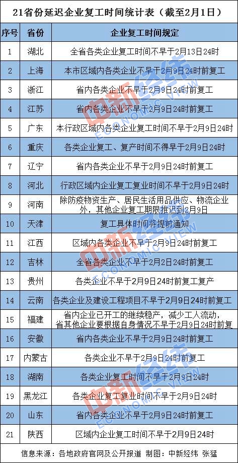 截至发稿时,湖南、广东、上海、重庆、江苏、浙江、河南、河北、山东、安徽、贵州、云南、福建、辽宁、内蒙古等19省份区域内企业复工时间不得早于2月9日24时,吉林不得早于2月2日24时,湖北不得早于2月13日24时。