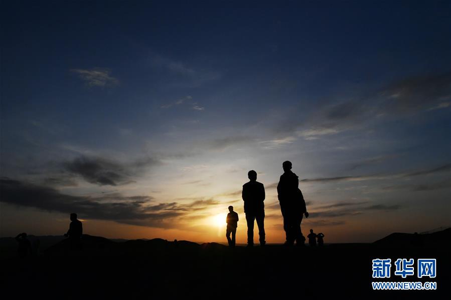 4月3日傍晚,游客在阳关欣赏大漠落日景色。 夕阳西下,在甘肃省敦煌市西南,中国古代丝绸之路重要关隘的阳关披上落日的余晖,大漠、烽燧、夕阳构成一幅壮美的迷人画卷。 新华社记者 陈斌 摄
