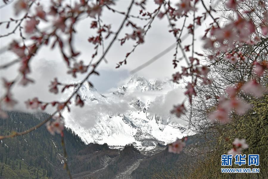 位于波密县西北部的朱西冰川与山花相映成趣(4月3日摄)。