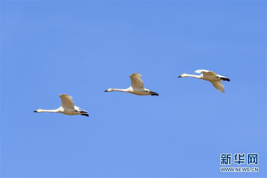 天鹅在杭锦旗独贵塔拉镇的黄河浅滩上飞翔(4月2日摄)。