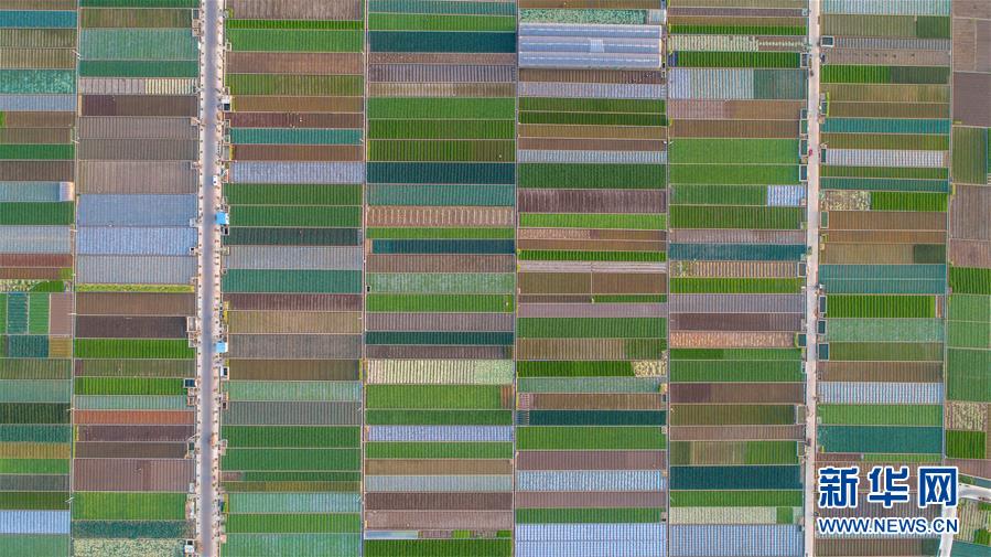这是云南省玉溪市通海县的田园风光(4月2日无人机拍摄)。 时下正值农忙时节,云南省玉溪市通海县的农作物长势喜人,秀美田园春色组成一幅色彩斑斓的画卷。 新华社记者胡超摄