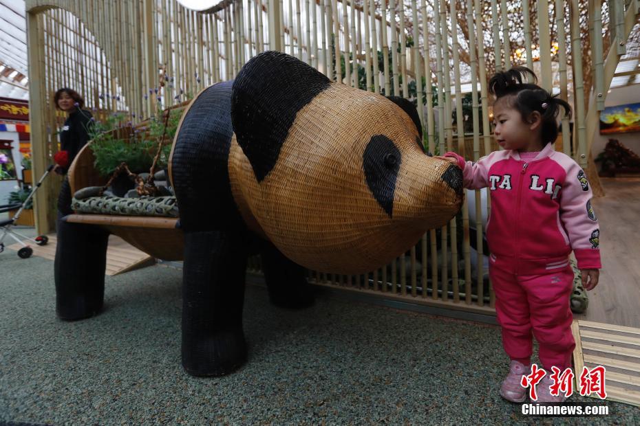 4月29日,2019年中国北京世界园艺博览会(简称北京世园会)开园,正式对公众开放。图为一名小朋友在中国馆内与熊猫景观合影留念。中新社记者 韩海丹 摄