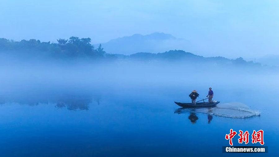 近日,位于安徽省宣城市泾县的桃花潭畔景区出现云雾景观,宛如仙境。桃花潭位于泾县以西40公里处,南临黄山、西接九华山,与太平湖紧紧相连,因唐代诗人李白《赠汪伦》而名扬天下。桃花潭畔青弋江位于太平湖陈村水库下游,因江面奇美的云雾景观而著称。青弋江的水由于温差的效应再加上两岸植被茂盛,水面常年云雾弥漫,如梦如幻。青弋江水质清澈明净,两岸绿树成荫。每当旭日东升和夕阳西下,宛若一条玉带在峡谷中飘拂,云蒸霞蔚,朦胧缥纱,恍入仙境,被人誉为“诗意山水,仙境人生”。图为江面上撒网捕鱼的老翁。文/李小白 张俊 图/李小白