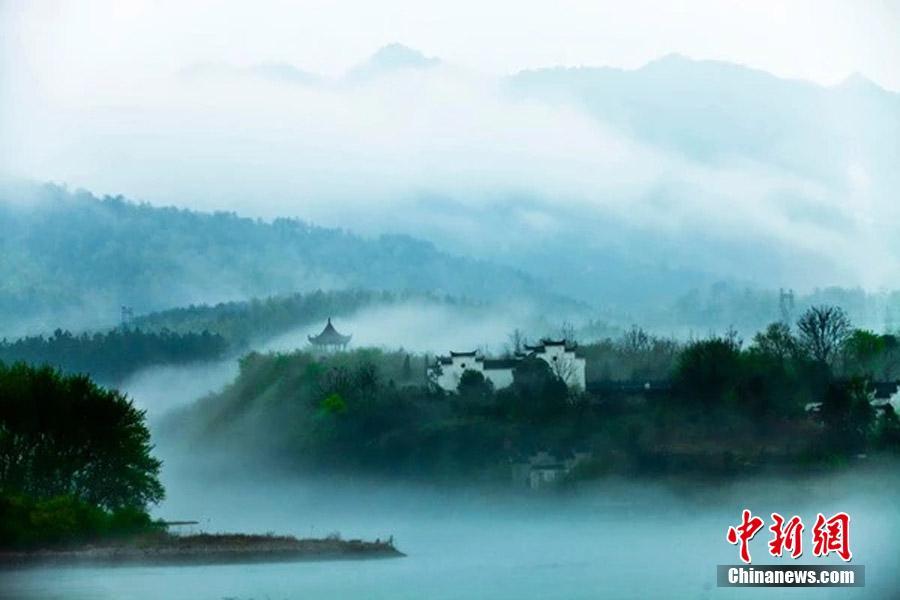 安徽泾县桃花潭畔云雾景观宛如仙境