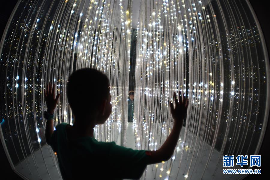 5月27日,一名孩子在数博会“追梦·未来”数字艺术特展上体验艺术作品《梦立方》。 2019中国国际大数据产业博览会5月26日至29日在贵阳举行,作为今年数博会展览之一的“追梦·未来”数字艺术特展,以其独特的科技体验与艺术表现形式,吸引众多观众前来观展并体验。 新华社记者 杨文斌 摄