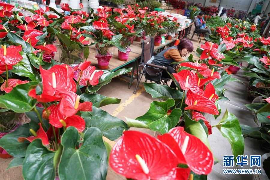7月9日,商家在昆明斗南花卉市场内整理红掌盆栽花。 中国昆明国际花卉展将于7月12日至14日举行。 新华社记者 秦晴 摄