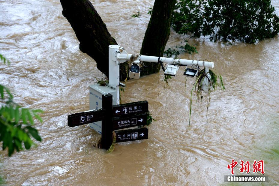 7月9日,受连日来持续强降雨影响,福建武夷山河水暴涨,武夷山风景名胜区全面闭园,暂停接待游客。图为当地一处路边的指示牌即将被洪水淹没。中新社记者 王东明 摄