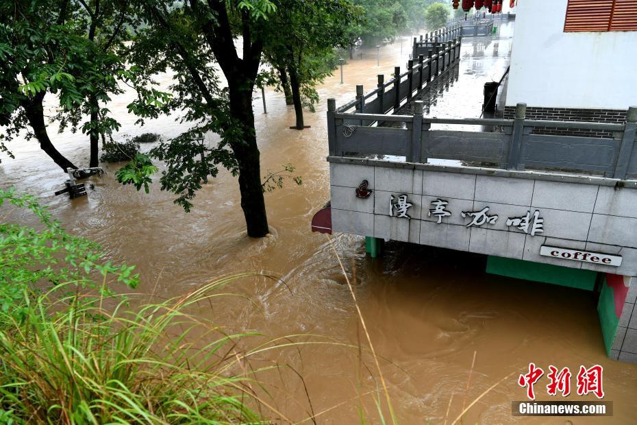 7月9日,受连日来持续强降雨影响,福建武夷山河水暴涨,武夷山风景名胜区全面闭园,暂停接待游客。图为当地一咖啡店已被洪水淹没。中新社记者 王东明 摄