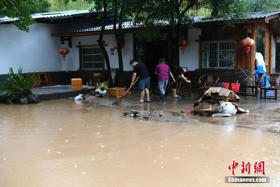7月9日,受连日来持续强降雨影响,福建武夷山河水暴涨,武夷山风景名胜区全面闭园,暂停接待游客。图为当日下午洪水退去,村民整理卫生。中新社记者 王东明 摄