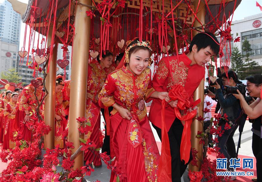 11月3日,新人在集体婚礼上穿过“幸福门”。新华社记者 姜克红 摄