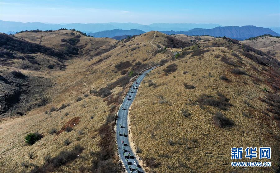 11月10日,摩托车爱好者驾车行驶在神田草甸的公路上(无人机拍摄)。新华社记者 陶明 摄