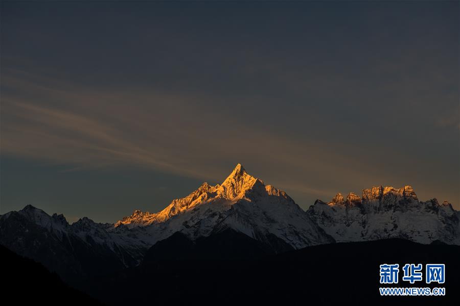 日出时分,阳光照射在梅里雪山缅茨姆峰上(11月8日摄)。 初冬时节,位于云南省西北部的迪庆藏族自治州境内的梅里雪山、普达措、纳帕海、白水台等景色迷人。 新华社记者 胡超 摄