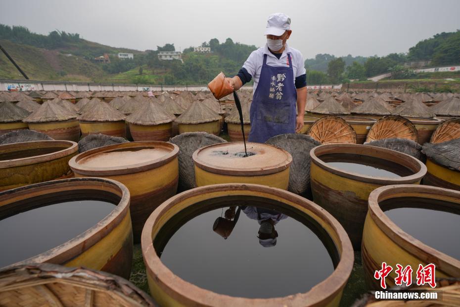 11月11日,工人在贵州省赤水市一家醋厂内查看醋的发酵情况。“赤水晒醋”采用固体发酵繁殖产生天然醋酸菌,醋坯和成品醋均在阳光下长久曝晒而成,故称晒醋。“赤水晒醋”历史悠久,这种古法酿醋技艺以当地优质大米、糯米、纯中药制作醋曲,经过蒸煮、酿晒、发酵等30余道工序制作而成,近年来,当地政府加大保护和宣传力度,使这种古法酿醋技艺得以保护和传承,产品深受消费者青睐。2009年,“赤水晒醋”被列入贵州省级非遗名录。中新社记者 贺俊怡 摄