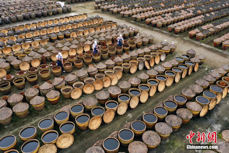 11月11日,工人在贵州省赤水市一家醋厂晒醋区内作业。