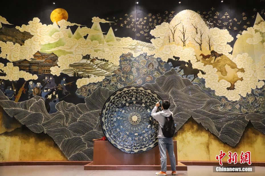 11月16日,一位参观者拍摄博物馆内的水族文化雕塑墙。“水族文化博物馆”位于中国唯一的水族自治县——贵州省黔南布依族苗族自治州三都水族自治县。馆内设有两大展区、6大板块、31个展位,以图片、文字、实物等多种形式结合,展示了水族概况、水族文化、习俗与节日等内容。中新社记者 瞿宏伦 摄