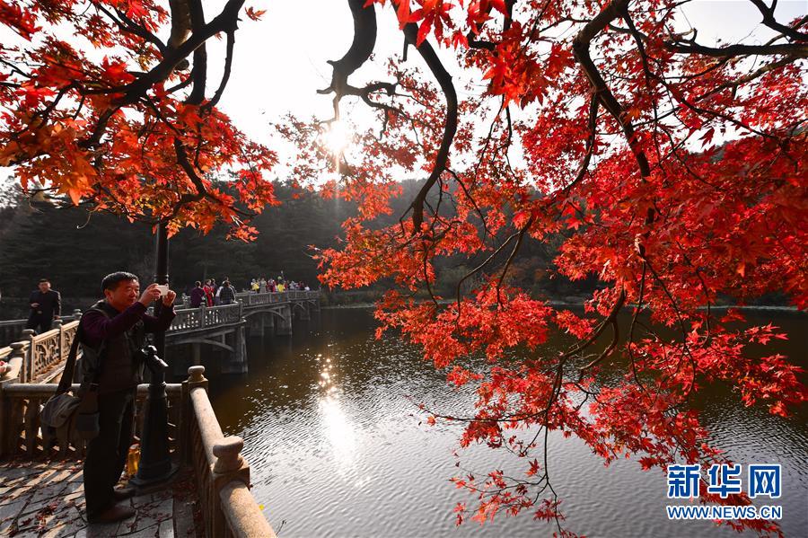 11月17日,游客在庐山如琴湖边游玩。 初冬时节,江西庐山风景区层林尽染,火红的枫叶吸引众多游客前来参观,令人流连忘返。 新华社记者 胡晨欢 摄