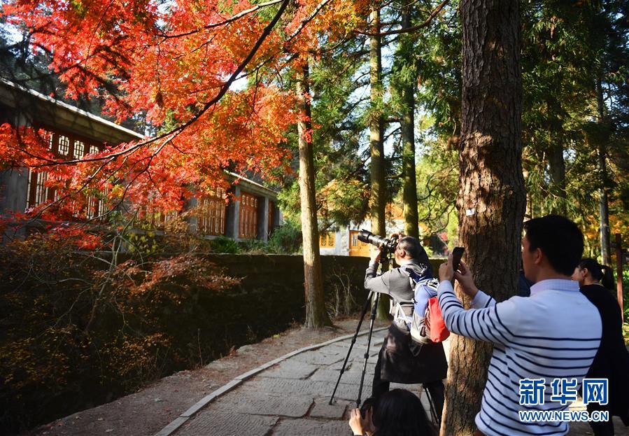 11月17日,游客在庐山如琴湖旁拍照。 初冬时节,江西庐山风景区层林尽染,火红的枫叶吸引众多游客前来参观,令人流连忘返。 新华社记者 张浩波 摄