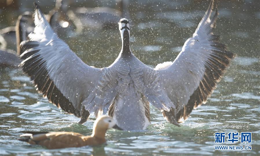 11月21日,候鸟在拉萨龙王潭公园水中嬉戏。 时下,斑头雁、红嘴鸥等不少候鸟陆续飞抵拉萨河谷、雅鲁藏布江沿岸等地避寒。 新华社记者 普布扎西 摄