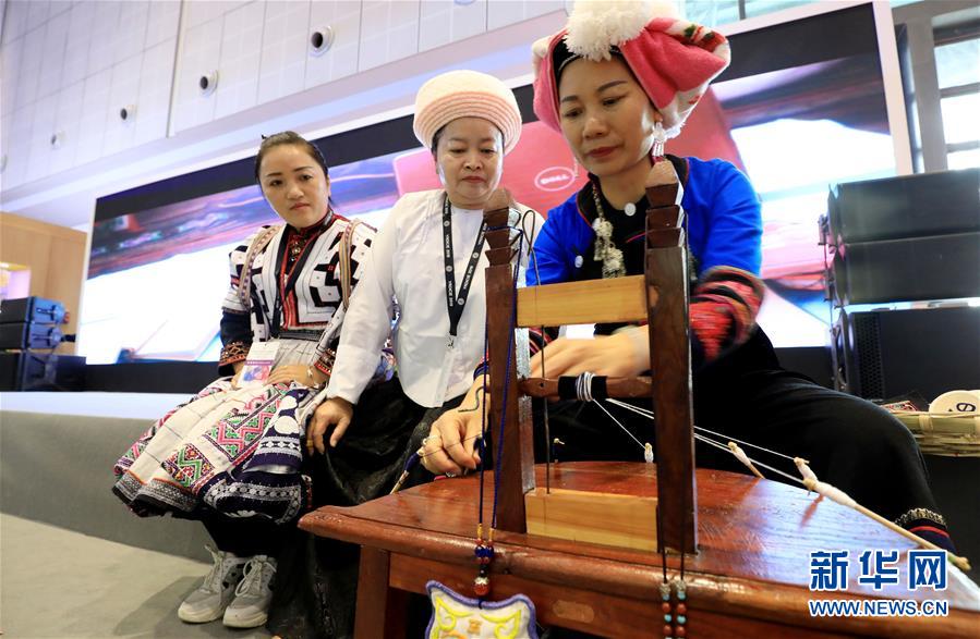 11月21日,来自云南的手工艺人(右)在博览会现场展示传统彝族编绣技艺。新华社记者 方喆 摄