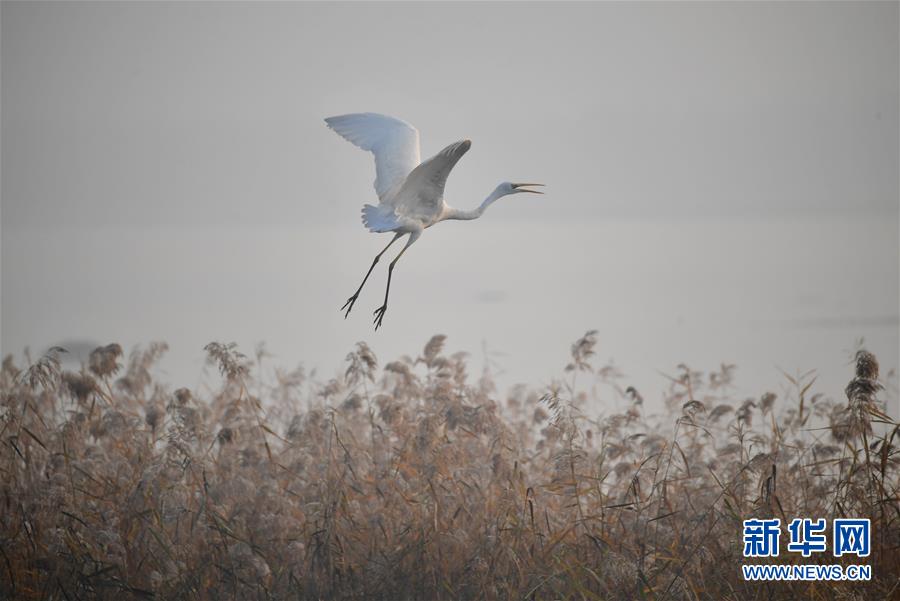 11月21日,一只白鹭在大荔县赵渡镇黄河湿地上空飞翔。新华社记者 邵瑞 摄