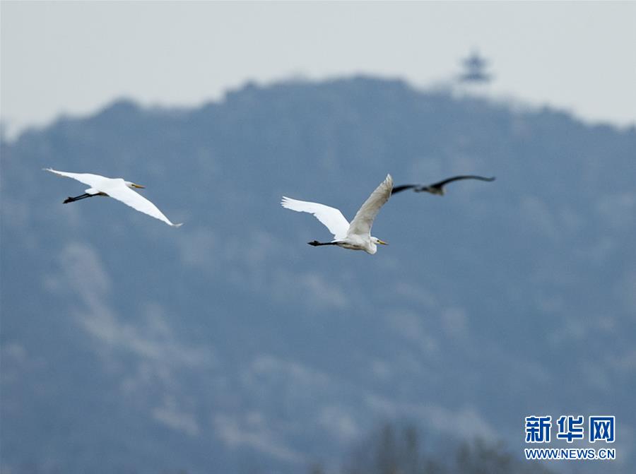 白鹭在济南鹊山水库上空飞翔(11月21日摄)。新华社发(黄国安 摄)