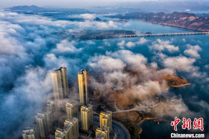 12月8日,江西武宁县城上空,一层层薄雾流动在高楼之间,伴随着日出美轮美奂,滚滚流动的云雾,美不胜收。 罗鑫钢 摄